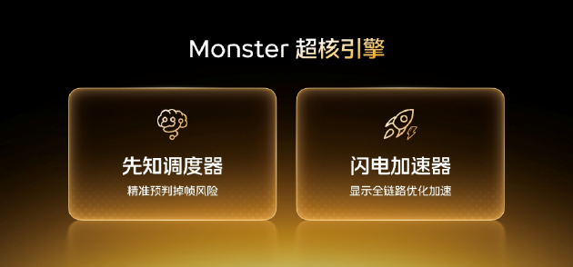 “先知调度器”是 Monster 超核引擎的大脑,它可以预测每一帧游戏画面所需要的算力,从源头规避掉帧风险;也是“更懂游戏的指挥官”,预判性能需求,给芯片输出精准指令,统筹性能资源分配,针对玩游戏时多任务来回切换场景,Monster 超核引擎颠覆传统,将所有核芯的算力资源集中统一分配,杜绝“一核有难,七核围观”,必要时还为游戏线程开设 VIP 通道,确保绝对的算力优势,怎么玩都流畅。